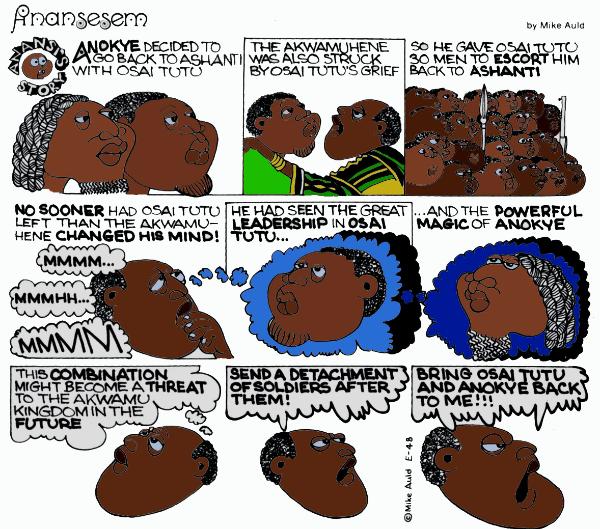 This Anansesem was a researched, published comic strip of a folkloric story about the Golden Stool of Ashanti, Asantihene Osei Tutu and his cousin Okomfo Anokye, the Priest and the founders of the Ashanti Confederacy.