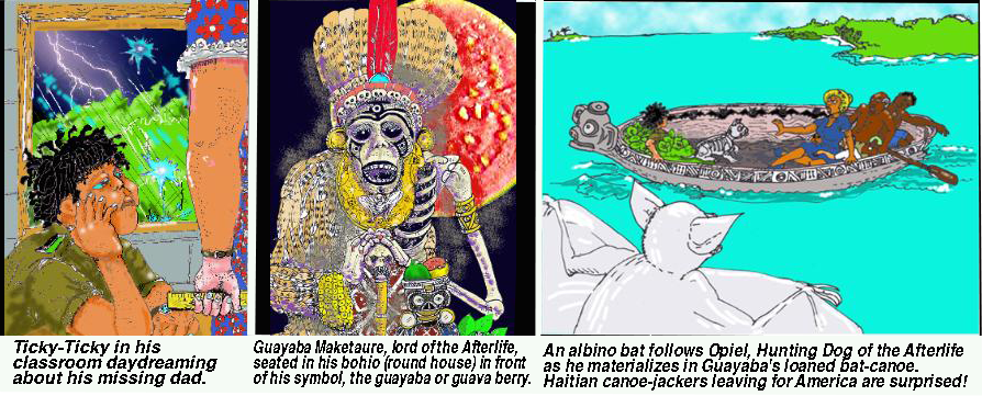 Ticky-Ticky's search took him to Coabey, the Taino Island of the Dead. There he borrowed Opiel, the Searchdog of the Absent, and a flying, time traveling Bat-canoe. Next stop was HaitiHaiti You can see a synopsis of that story at http://anansistories.com/Ticky_Ticky.html.