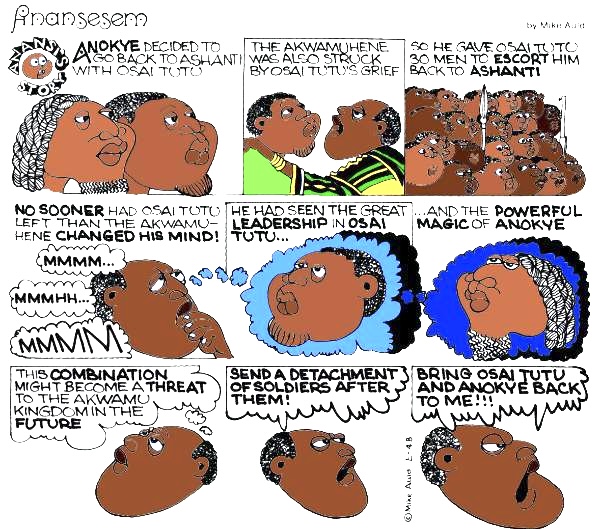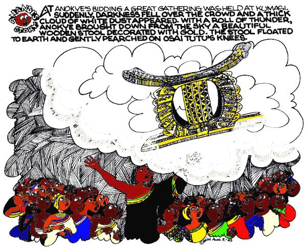 Above: As the first Asantihene or ruler and the founder of the Asanti Confederacy, Osei Tutu magically became the Devine anointed ruler of the Asanti, when a golden stool mysteriously floated down and perched on his knees, in the colorized panel below.