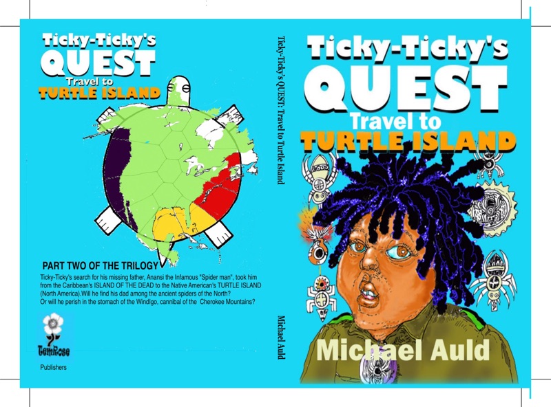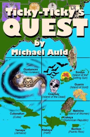 Above: The book’s cover with Caribbean areas visited by Ticky-Ticky’s travel with the search Dog of the Dead and a flying, time traveling bat-canoe loaned to him by his god-relative, Maketaurie Guyaba, God of the Afterlife’s Island of the Dead and the Sweetness of Life’s guava.