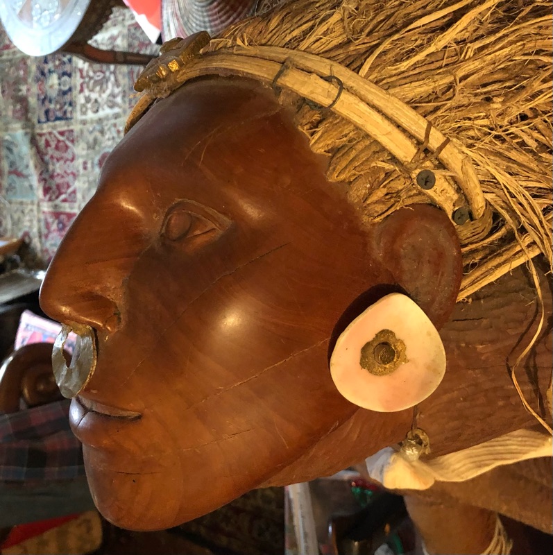 Above: The author’s “Anacaona” cherry wood sculpture with a conch shell earring.