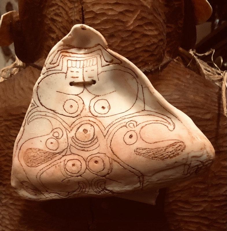 Above: The author’s incised pink Queen conch shell pendant for the Anacaona sculpture, found on a Bull Bay beach in Jamaica naturally shaped in that triangular theater-pointed shape of a sacred “cemi” icon.